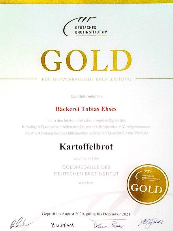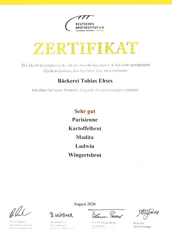 Das Deutsche Brotinstitut führt in ganz Deutschland Qualitätsprüfungen von Backwaren durch, an denen sich handwerkliche Bäckereien auf freiwilliger Basis beteiligen können. Hochqualifizierte Sachverständige bewerten dabei nach wissenschaftlich anerkannten Kriterien. Die Brotprüfer sind Bäckermeister mit Zusatzausbildung zum sensorischen Sachverständigen. Sie prüfen jährlich rund 20.000 Brote, Brötchen und andere Backwaren nach einheitlichen Qualitätskriterien. Das Kartoffelbrot der Backstuff Tobias Ehses wurde für drei Jahre hintereinander gleichbleibende sehr gute Qualität und Backleistung jetzt mit GOLD prämiert. Das Zertifikat sehr gut erhielten 2020 folgende Brote der Backstuff: Parisienne - Kartoffelbrot - Madita - Ludwin - Wingertsbrot, sowie Weizenmischbrot - Komißbrot - Bauernbrot - Heubrot - Emmervollkornbrot. Weiterhin erhielten das Zertifikat mit Gut: Dinkel-Emmer-Vollkornbrot - Kasperbrot - Schweizer Landbrot - Roggenmischbrot - Bierbrot und das Römerbrot!
